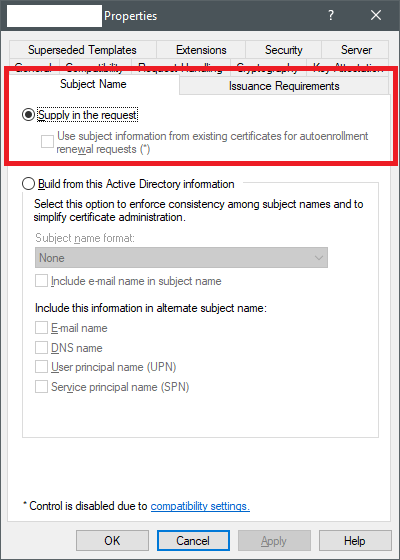 Below shows the same certificate template setting via GUI when inspecting certificate templates via `certsrv.msc`:\ <img src="https://386337598-files.gitbook.io/~/files/v0/b/gitbook-x-prod.appspot.com/o/spaces%2F-LFEMnER3fywgFHoroYn%2Fuploads%2FlSycJqxClh9Mu0UwEGHP%2Fsuppy-in-request.png?alt=media&#x26;token=56524651-56c3-49b7-bf07-b637b814016a" alt="" data-size="original"><br>
