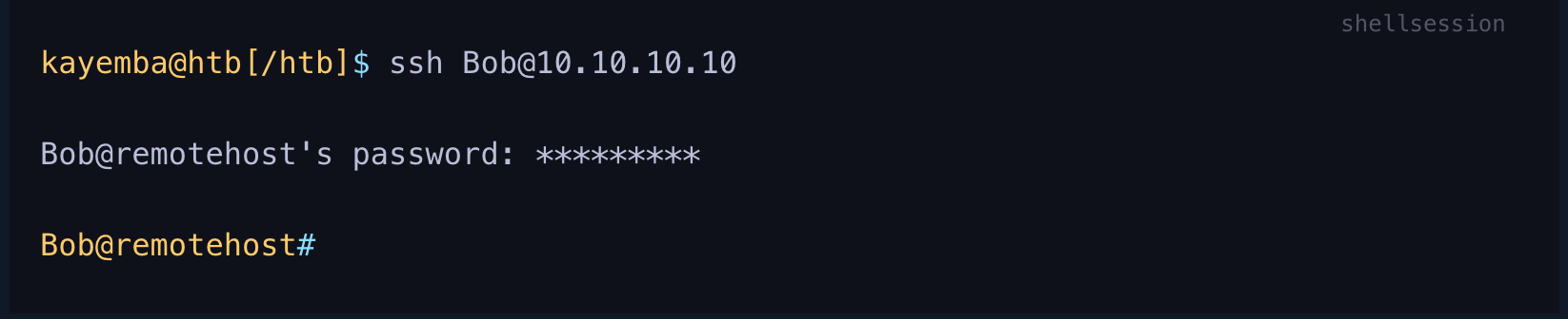 An SSH connection is typically much more stable than a reverse shell connection and can often be used as a "jump host" to enumerate and attack other hosts in the network, transfer tools, set up persistence, etc. If we obtain a set of credentials, we can use SSH to login remotely to the server by using the username `@` the remote server IP, as follows: